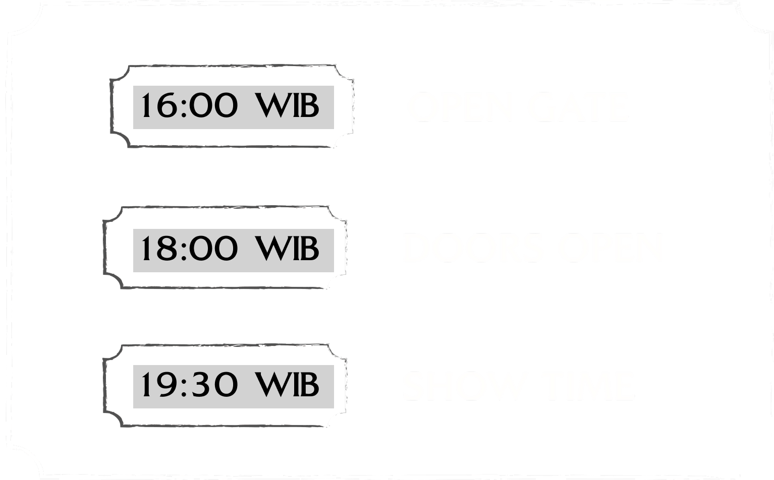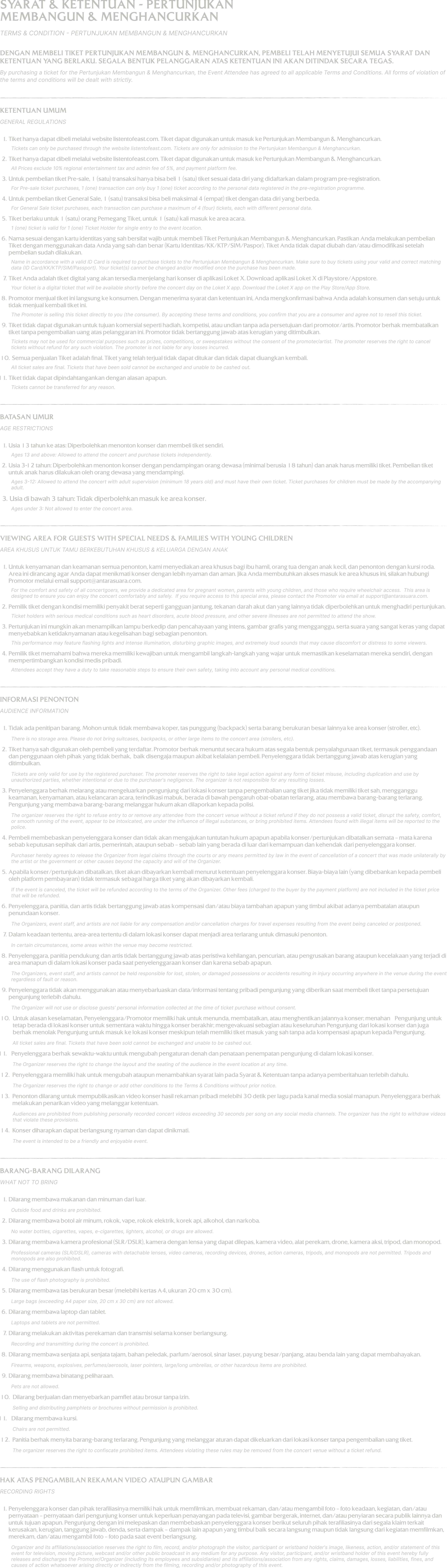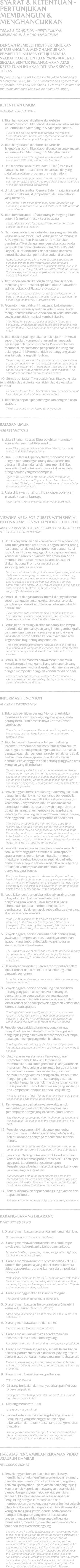 PERTUNJUKAN INI MEMBERLAKUKAN ATURAN RE-ENTRY UNTUK PEMEGANG TIKET DENGAN SYARAT WRISTBAND TETAP UTUH DAN TIDAK RUSAK WRISTBAND YANG TERLEPAS, RUSAK, ATAU TERINDIKASI TELAH DILEPAS TIDAK AKAN BERLAKU LAGI SEBAGAI AKSES MASUK.