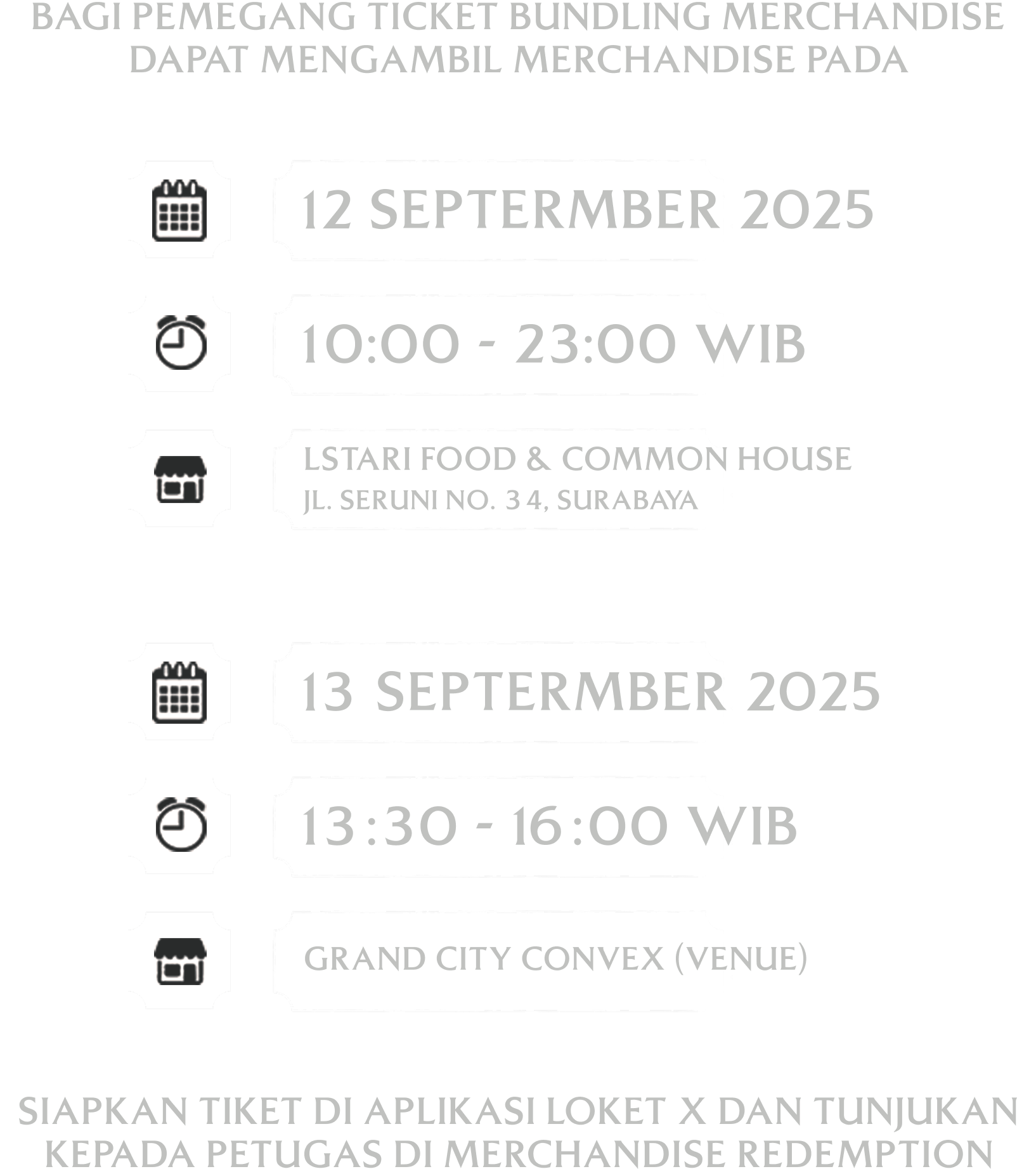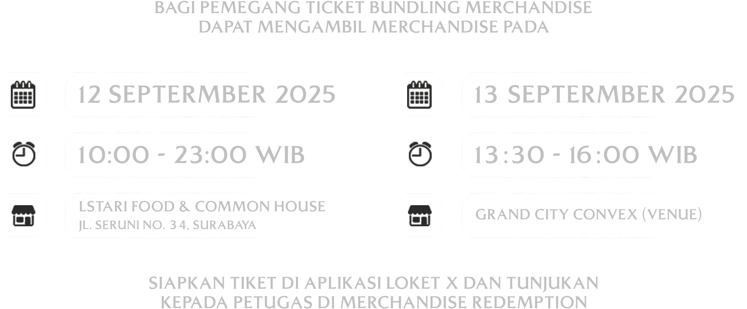 AKSES MASUK KE AREA PERTUNJUKAN HANYA BISA MELALUI MALL GRAND CITY LEVEL 4.